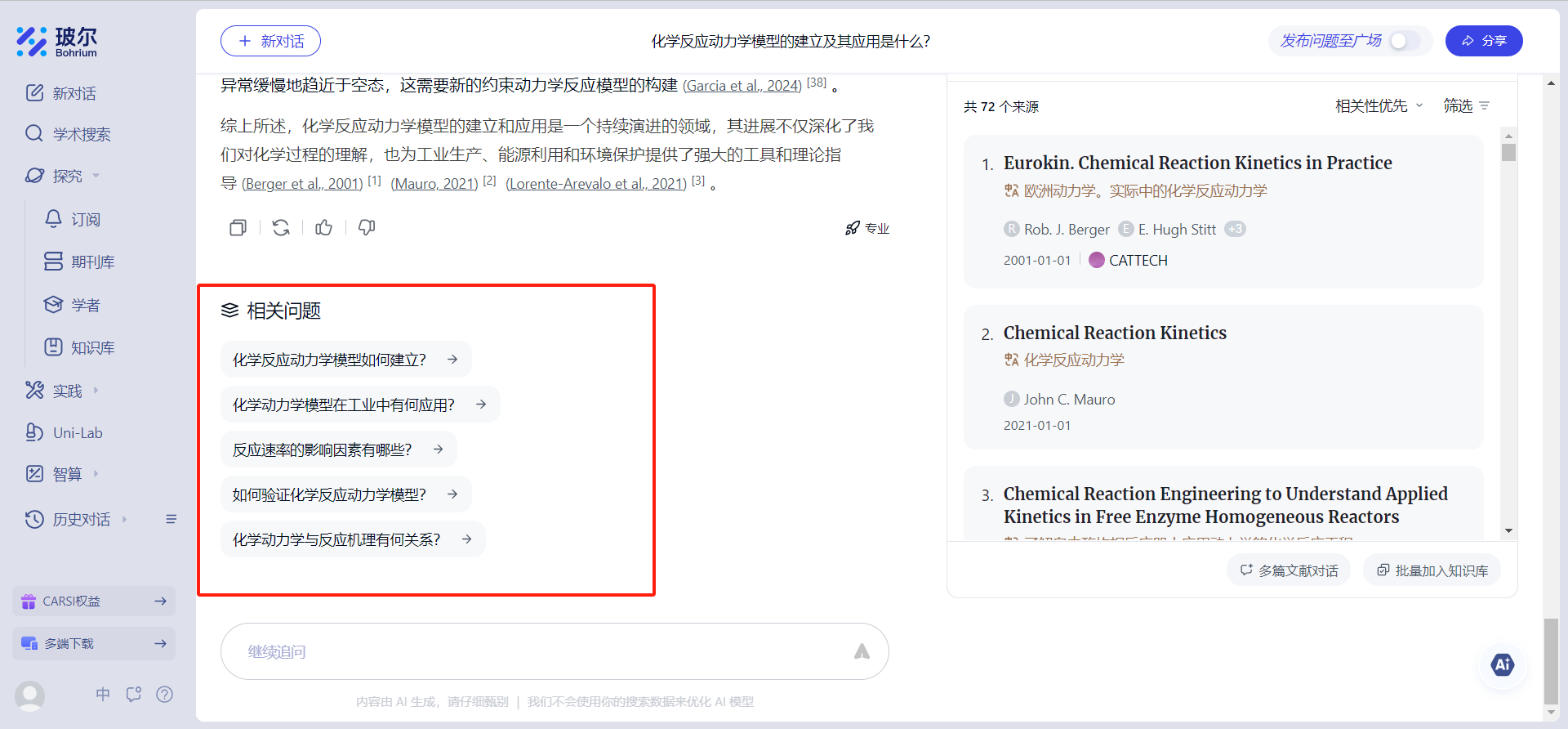 玻尔科学导航作为 “科学家的AI学术智库”,深度整合了超过 1.6 亿篇全领域文献、14 万本核心期刊及全球 2000 万学者研究成果,构建起覆盖化学工程、材料科学、有机化学、分析化学、催化化学等化学化工全领域的知识网络。依托平台提供的智能文献分析引擎,可实现对化学化工期刊论文的深度价值挖掘,从 AI 驱动的材料发现,到基于化学反应和工艺数据的文献深度解析,再到支持科研协作的团队、个人知识管理系统,平台将构建覆盖化学化工研究全流程的智能支持体系,助力我院教师和研究人员从基础文献工作中解放,更专注于科研创新。
