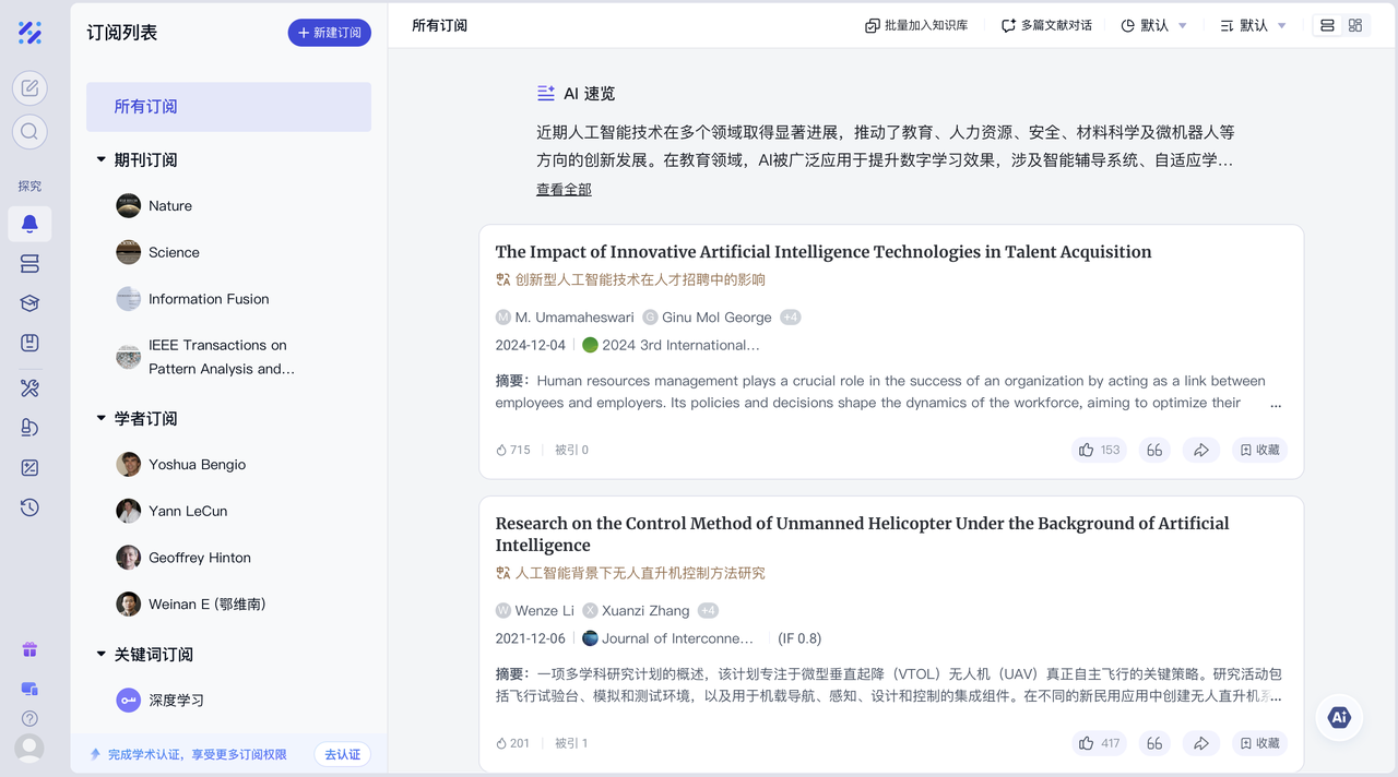 你可自定义订阅关键词、期刊或专家学者,平台将自动给你推送相关领域的前沿成果。你还可以借助“AI速览”功能及时掌握动态、拓展研究视角,或与感兴趣学者的“学术分身”进行对话,拓展跨学科研究视角,激发交叉思维。