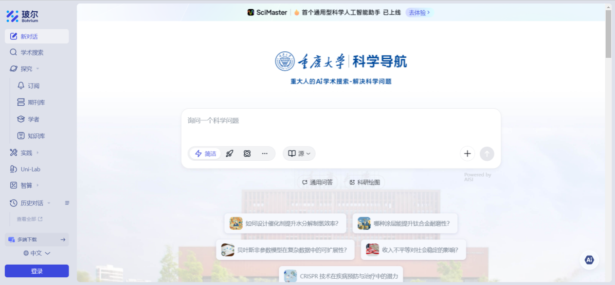 推出“新一代科研知识库与 AI 学术搜索平台”——玻尔科学导航。该平台基于前沿人工智能技术,深度融合智能检索与知识问答功能,旨在解决学术信息分散、文献获取效率低、研究协作不便等科研痛点。平台以推动学术创新为目标,为我院研究人员提供精准、深度、可靠的智能文献检索与知识发现服务,构建智能化、高效化、可信化的科研支持体系,全面赋能化学化工研究工作。