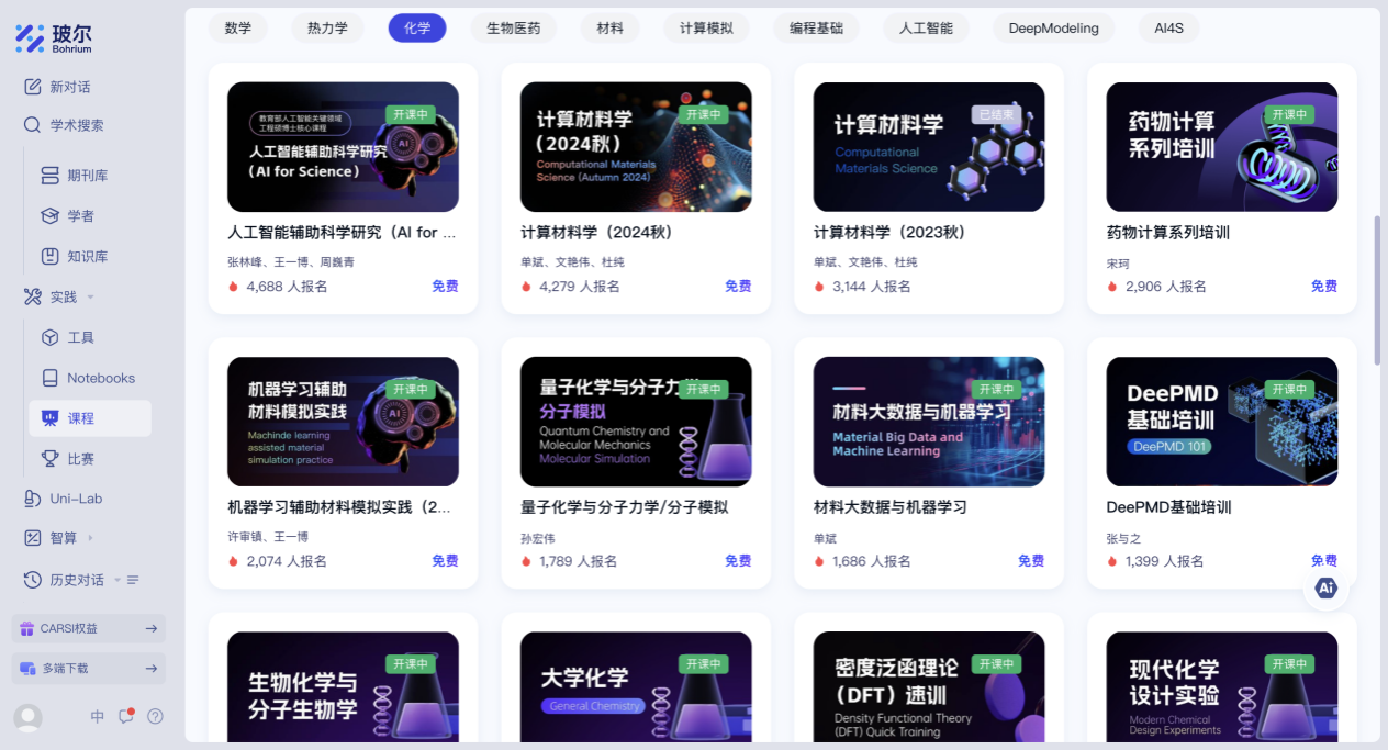 科研之外,玻尔还提供超 200 项科研工具APP,涵盖图表绘制、文献管理、数据分析、可视化建模等多个环节,均可灵活调用;并提供百余门 AI for Science 课程资源,你可以自由开展 AI for Science 相关内容的学习和拓展。