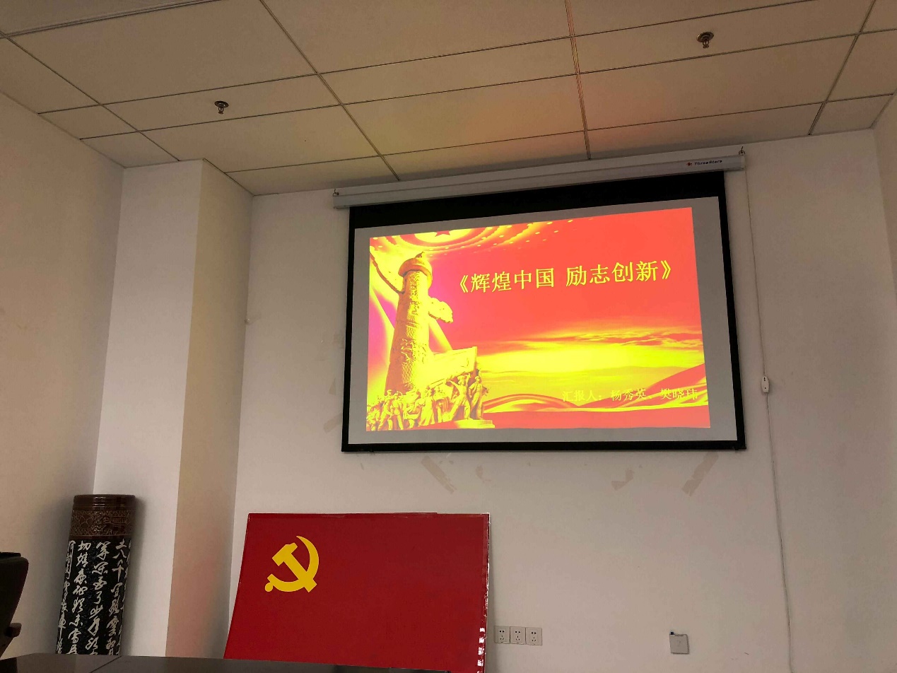 首先,杨秀英和樊晓伟同志带领大家观看了《辉煌中国 励志创新》的记录片,回顾了我们党几十年以来在政治,经济,文化,科技上取得的巨大成就,其中一个片段是在劳动密集型产业中,已经出现了“机器人换人”的趋势,科技的发展,机器的智能化,越来越给我们的生活带来了便利。当然,我国长久以来取得的历史性成就充分展示了中国人民获得感、安全感、自豪感、幸福感的途胜,真实的记录了中华民族由站起来,富起来,强起来的历史性飞跃。