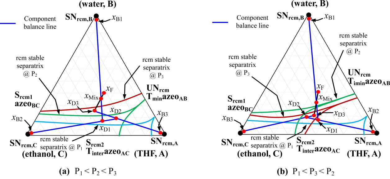 化工、制药、电子等行业存在着较多对压力敏感的三组分(或多组分)多共沸体系。采用传统分离方法难以实现高纯度的分离,三塔(或多塔)变压精馏是一种有效的分离手段。如何实现分离?如何选择合适的压力?如何实现最小的能耗?成为了研究的难点和热点。本课题组在已有的相关热力学研究基础上,以四氢呋喃-乙醇-水三元体系为例进行了详细的热力学可行性分析,探讨了两种可行的分离序列,并分别对其进行优化设计和有效控制。这对后续的三组分(或多组分)多共沸体系的研究提供了重要的理论依据和指导作用。