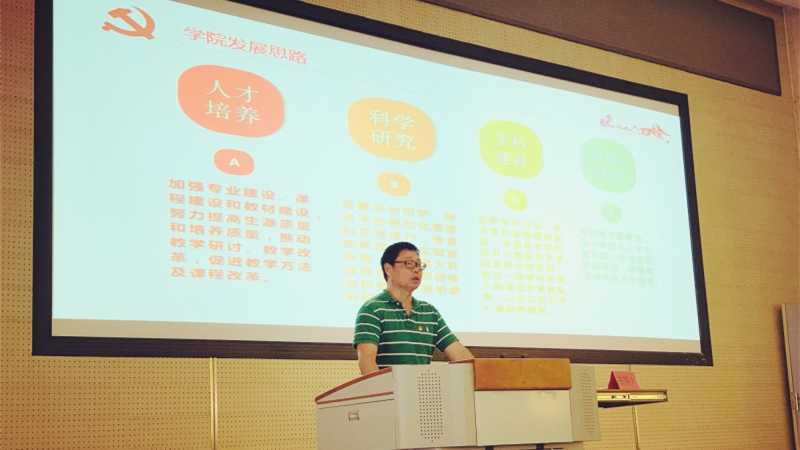 刘仁龙书记根据教育方针、教育成就、怎样办教育、培养什么样的人、立德树人、六个下功夫、强化三种理念及三个责任八个关键词依次对习近平新时代教育思想与理念进行了阐述。随后,书记从学院发展机遇和发展思路两方面介绍了将学院将开拓注重人才培养、完善平台构架、强化思想教育、整合资源、完善队伍建设制度等工作新局面,以营造团结向上的学习氛围,让党员充分发挥引领作用,体现党的核心力量,保证学院抓住发展的机遇争取学院更上一个台阶。