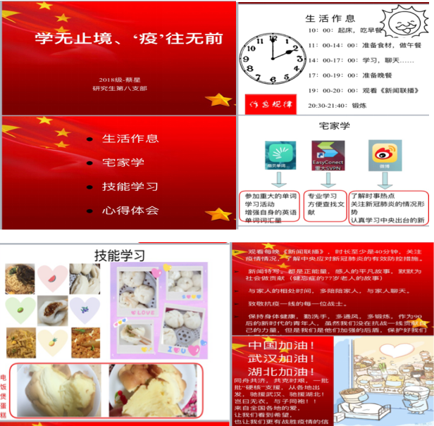 “停课不停学”,关键时期更不能放松学业。研究生八支部通过网络视频组织生活和学习经验分享的形式开展了“学无止境、‘疫’往无前”特色组织生活,支部党员以线上视屏讲解的方式展示了疫情期间自己的学习方法,分享自己或者身边同学在家的学习经验、学习计划、常用软件、作息时间表等,相互交流学习,共同进步。
