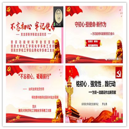 党委书记刘仁龙同志首先代表学院致欢迎辞,并充分肯定党建促进学术交流以及学科建设等方面的积极意义。重庆功能材料学会秘书长聂尊誉同志以“守初心、担使命、新作为——为功能材料发展而努力奋斗”为主题、化学系教工支部书记范兴同志以“不忘初心,砥砺前行”—如何发挥党员作用帮助青年教师克服学术起步困境” 为主题、应化系教工支部书记罗志勇同志以“悟初心,强党性,践行动——为双一流建设作出新贡献” 为主题,先后发言。分别介绍了各自支部的情况,共同发出“将论文写在祖国的大地上,让科技服务创造新的价值”的倡议。