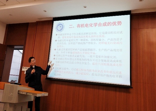 会上,张新胜教授主要从有机电化学合成和电化学过程放大两个方面进行阐述,介绍了有机电化学发展历程,常见的有机电化学反应类型以及有机电化学合成新的研究进展。在电化学过程放大方面,介绍了电化学过程放大路径,中试放大研究的目的和研究内容,以及工业电解槽的选择和设计,并将他团队电解草酸制备乙醛酸的研究工作作为过程放大研究实例,与大家交流了电解过程放大的经验。