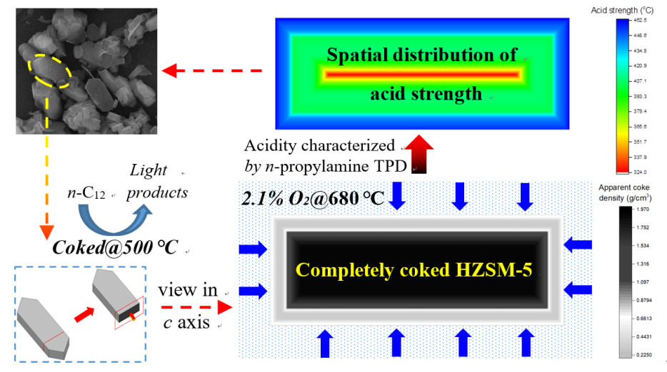 以HZSM-5分子筛为代表的固体酸分子筛催化剂广泛应用于催化裂解、甲醇制烯烃、甲醇制汽油等多种工业过程中,由骨架铝提供的酸性位是其主要催化活性位,合理的酸性位分布对提高催化活性、目标产物选择性和催化剂的寿命至关重要,而之前尚无在晶粒尺度上对酸性位分布进行直接、定量表征的有效手段。羡小超老师课题组在对催化剂积碳深入研究的基础上,提出了一种全新的解决思路:即先用积碳掩蔽HZSM-5分子筛的酸性位,然后再利用缩核氧化的方法实现控制酸性位从晶粒外表面向内的逐步释放,再结合宏观的酸性表征方法得到释放出酸性位的平均性质,最后根据增强的缩核模型将积碳氧化率转化为晶粒上的空间坐标,从而得到酸性强度在晶粒尺度的微分分布曲线。该成果可对固体酸分子筛催化剂酸性分布的精准设计提供有力的支撑,同时论文中建立的增强缩核模型也可单独用于催化剂积碳的空间分布表征。
