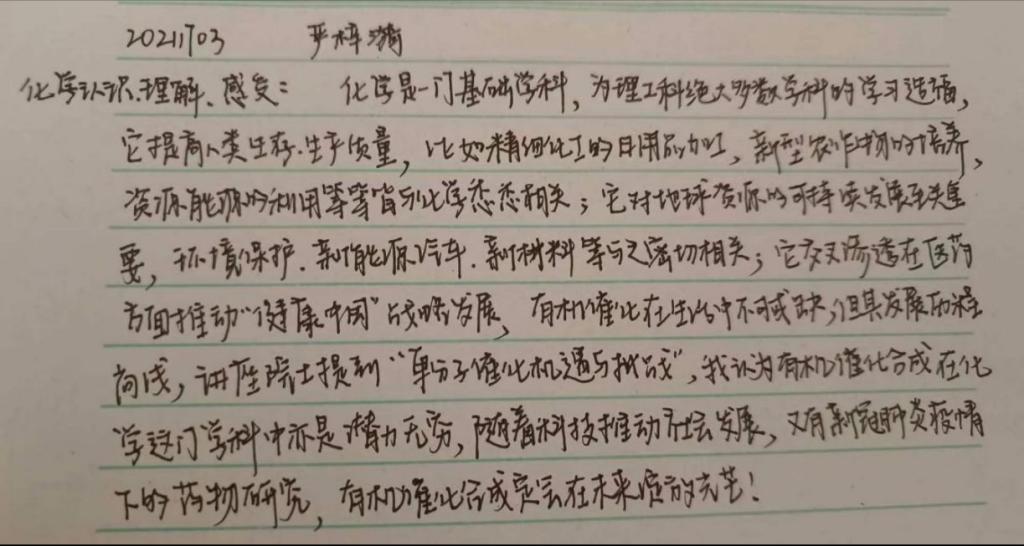 有机化学课程教学团队用一堂院士讲座开启新学期的授课。为了贴近当下,贴近专业,选取了李亚栋院士2021年11月《化学的机遇与挑战》报告。同学们在认真聆听了院士的报告后进行了线上师生互动,各位同学畅谈自己的观后感,同学们积极发言,一致认为该报告让他们对专业有了新的认识,最后让同学们把自己的认识和感触在线提交。