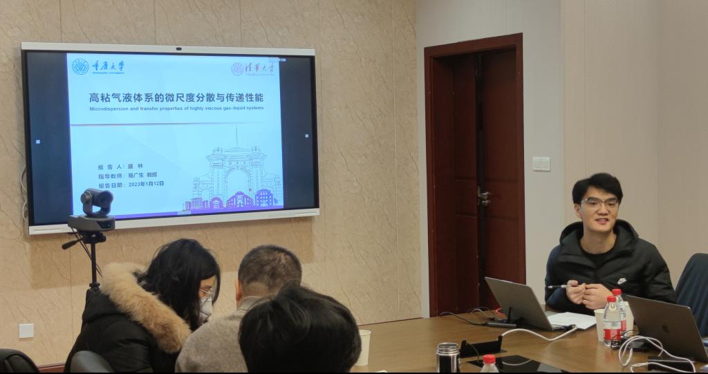 随后,清华大学带队负责人余思岑博士向与会化工学院的领导老师们介绍了来访同学的专业、研究方向以及导师团队等情况,盛林博士作为学生代表,作了题为“高粘气液体系的微尺度分散与传递性能”的学术分享报告。