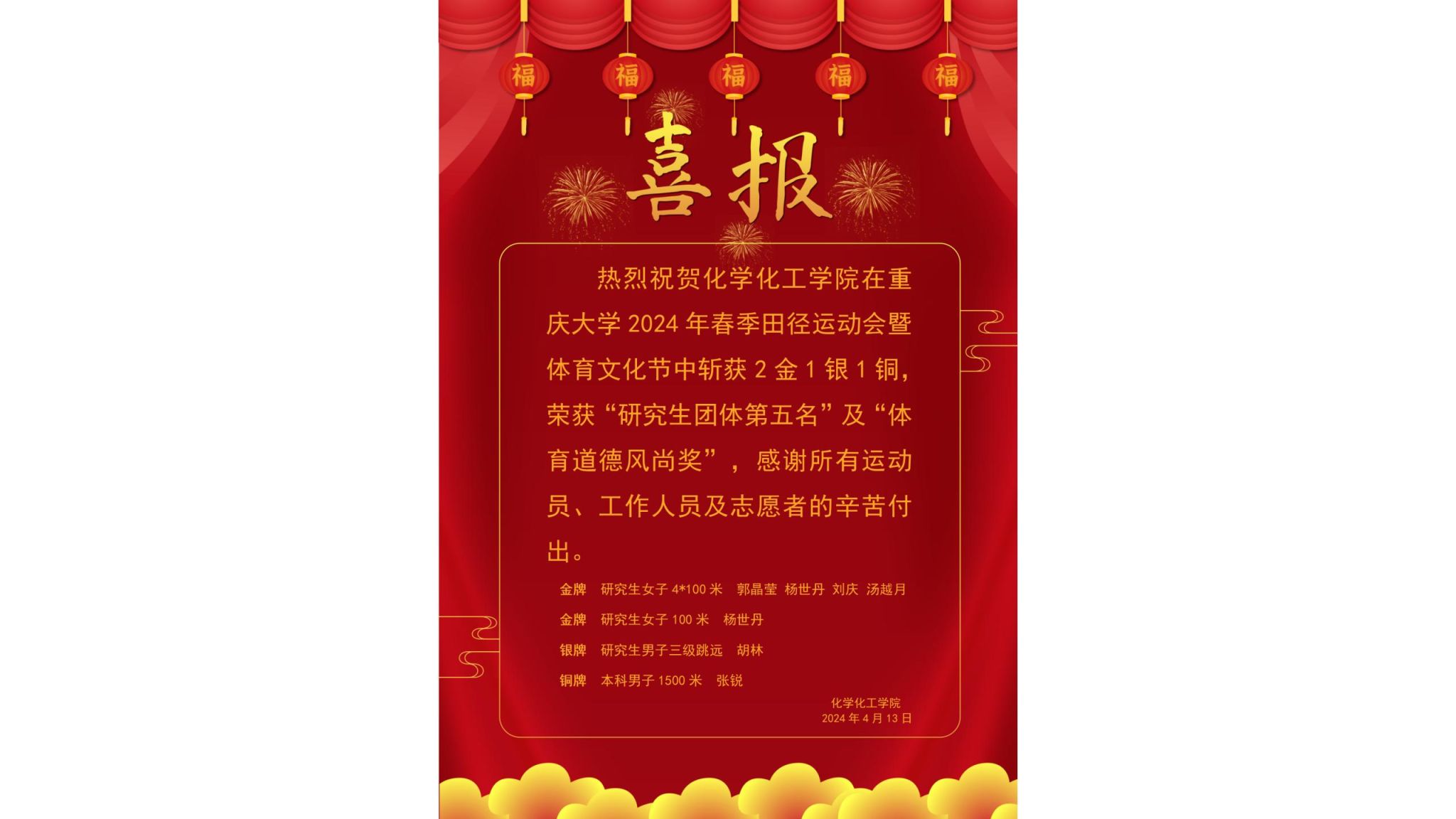 经过一天半的激烈比赛,化院学子斩获2金1银1铜的好成绩,获研究生团体第五名及“体育道德风尚奖”。