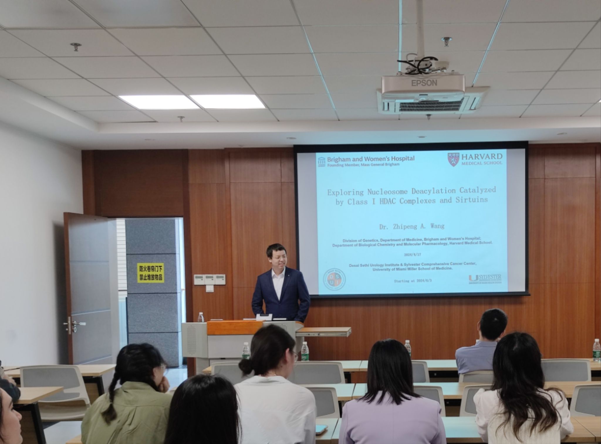 进行了一场关于Ⅰ类HDAC(组蛋白去乙酰化酶)配合物和Sirtuins在催化核小体脱酰反应中作用的深入报告。深入探讨了与衰老、癌症和神经退行性变等重大疾病相关的基因组不稳定性及表观基因组失调问题。学院李杨教授、李存璞教授、蔡云飞研究员、夏勇教授、秦波副研究员等25名学生参加了讲座。