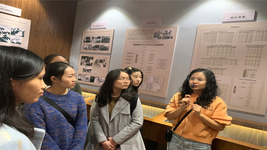 接着讲解员将我们从新时代带到了建校之初的历史中,通过图片,事物,雕塑使同学们感受到从建校初始到如今建设成双一流大学中的种种曲折,这九十年的风风雨雨,九十年的薪火相传,靠的是一代代重大人每一个坚实的脚印,才酝酿成今天如诗如画的辉煌。