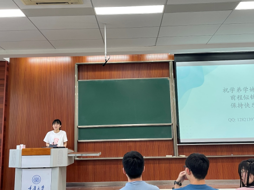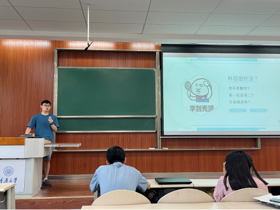 陈敬敏从考研前准备、复习阶段、复试三个方面入手,介绍了自己考研的过程并给予了同学们宝贵的经验。而接下来上台的杨晟博则从各个科目的具体复习方式、复习时间安排、教材以及刷题方式入手,从另一个角度为同学们提供考研经验。