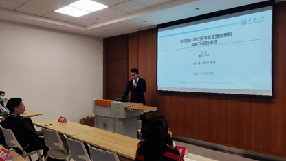 紧接着,数学与统计学院的博士研究生齐凯汇报了关于弹性网非平行双平面支持向量机及其几何合理性的研究,由研究背景逐渐深入,层层递进,环环相扣,再对机器学习进行专业性地剖析,得到了同学们热情的反馈。
