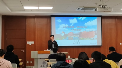 最后,物理学院博士研究生黄旭东汇报了“高能物理过程中QCD重整化能标设定及其应用和QCD圆圈计算”为主题的研究,讲述了学术信息、心得和成果,分享了如何选择研究课题,同时寄语同学们“脚踏实地,仰望星空”。