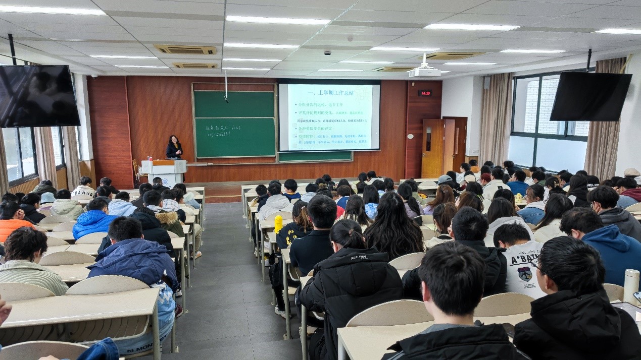 会议伊始,伍老师首先对上学期开展的工作进行了总结。上学期面临疫情的严峻挑战,同学们有序分批分次返乡,同时年级上完成了评奖评优,疫情防控等工作。