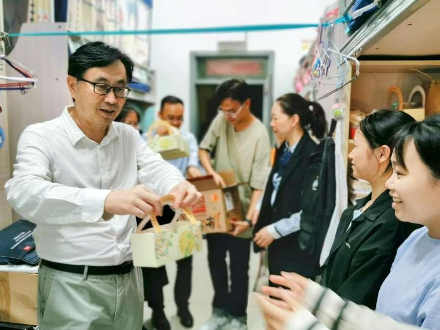 党委书记张云怀、党委副书记李泽全,学办主任谢丽,团委书记陈星辰及各年级辅导员一同前往学院学生宿舍,老师们向各位同学表达了节日问候并送上了学院定制的中秋月饼礼盒,然后与同学们在学习和日常生活等方面进行了亲切地交流,并强调了用电安全和实验室安全问题。